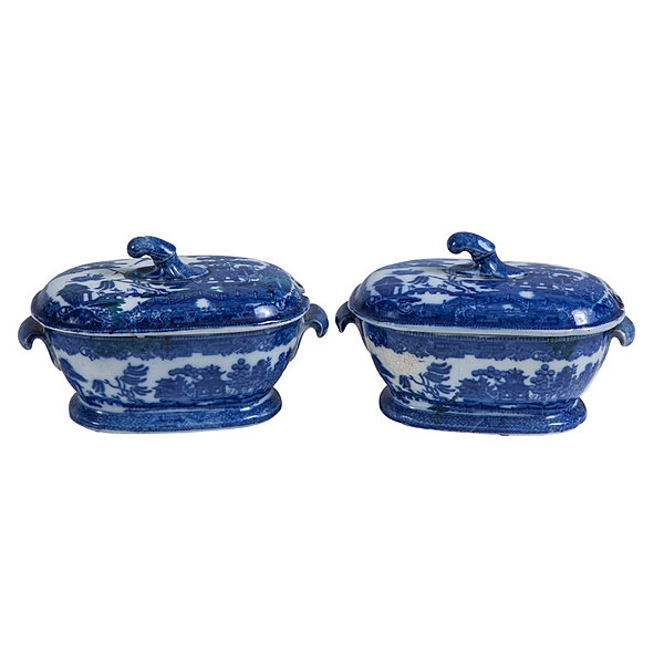 Pareja de salseras de loza con decoración "blue willow"