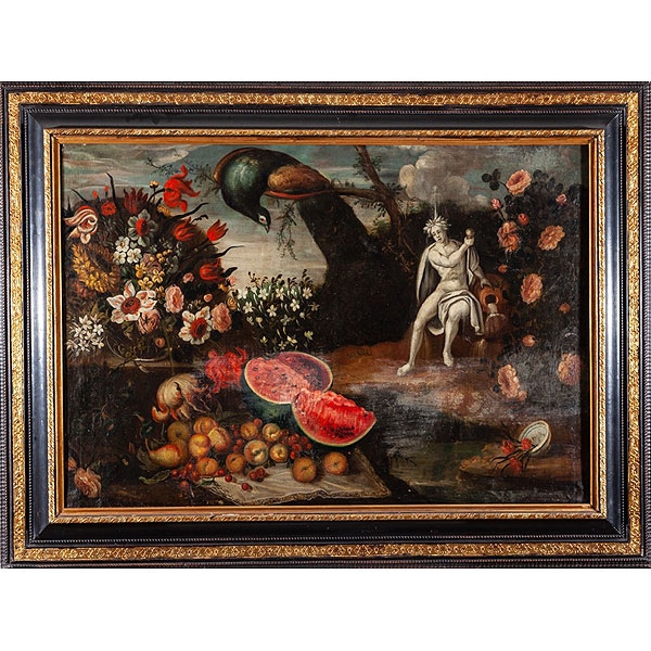 "Bodegón de flores y frutas"