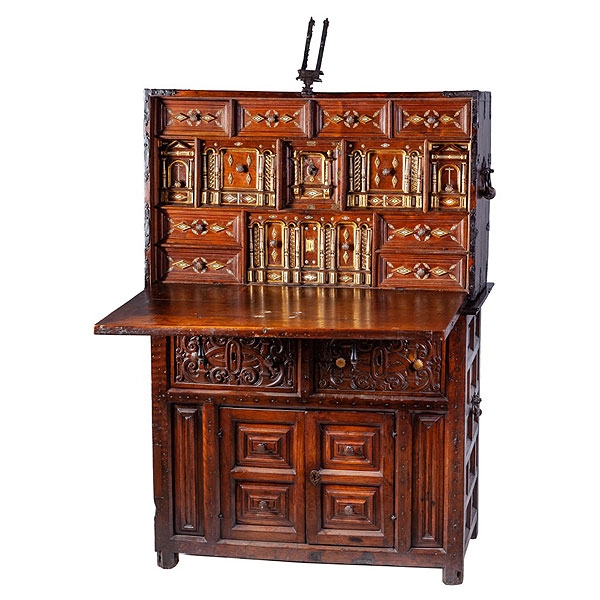Bargueño español de tapa abatible sobre taquillón tallado de nogal y herrajes de hierro con interior de columnillas de hueso formando motivos arquitectónicos, época Felipe IV S.XVII