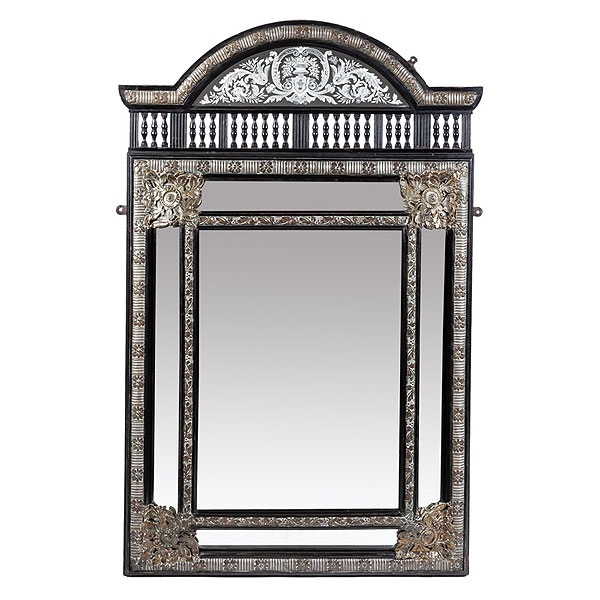 Espejo flamenco de madera ebonizada y metal plateado con copete superior en forma de galería y remate de vidrio grabado en forma de media luna, S.XIX