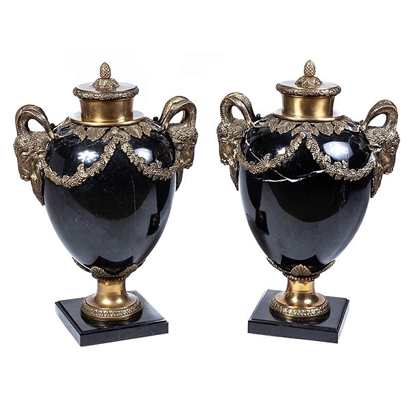 Pareja de urnas de mármol negro con monturas de bronce y asas de cabezas de carnero, estilo Luis XVI