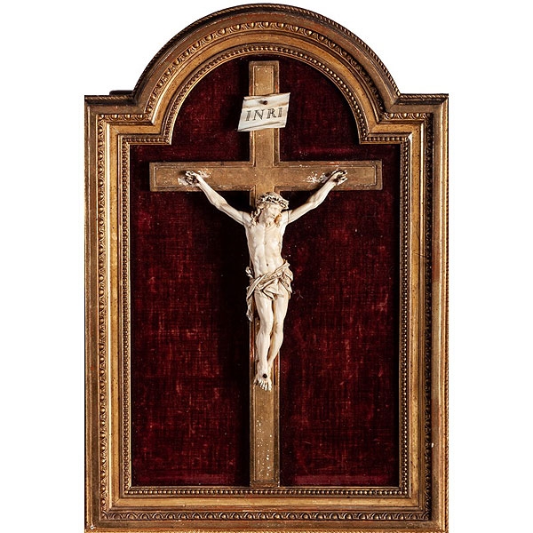 Cristo francés de marfil tallado sobre cruz y marco de madera tallada, trabajo de Dieppe pps.S.XIX