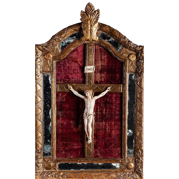 Cristo francés de marfil tallado con marco de madera tallada, dorada y espejos, S.XVIII