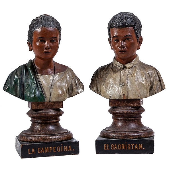 Pareja de bustos de madera tallada y policromada "La campecina" "El sacristán" c.1900
