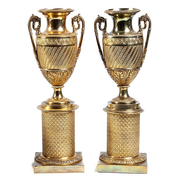 Pareja de ánforas sobre peanas de bronce dorado, trabajo francés de época Imperio, pps.S.XIX
