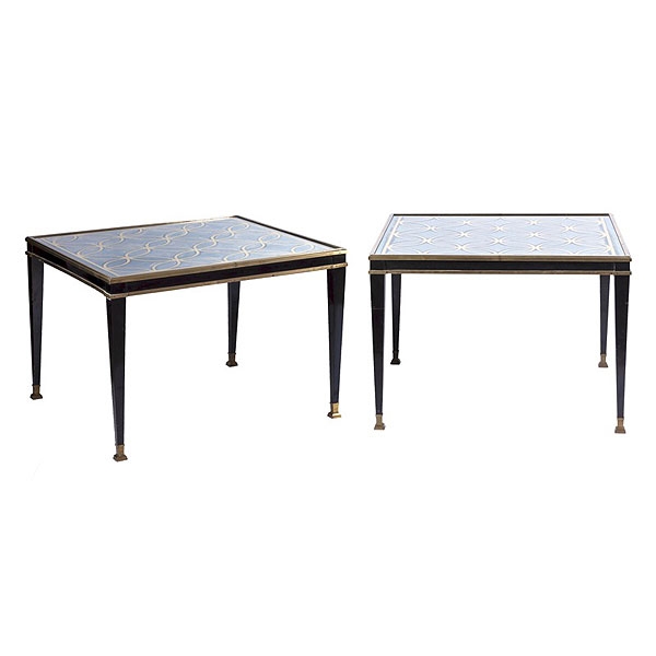 Marc du Plantier (Francia, 1901 - 1975) Pareja de mesas auxiliares lacadas en negro y bronce con tapas de vidrio eglomisé con decoración de círculos enlazados en dorado, años 40. Estampilladas "M. DU PLANTIER"