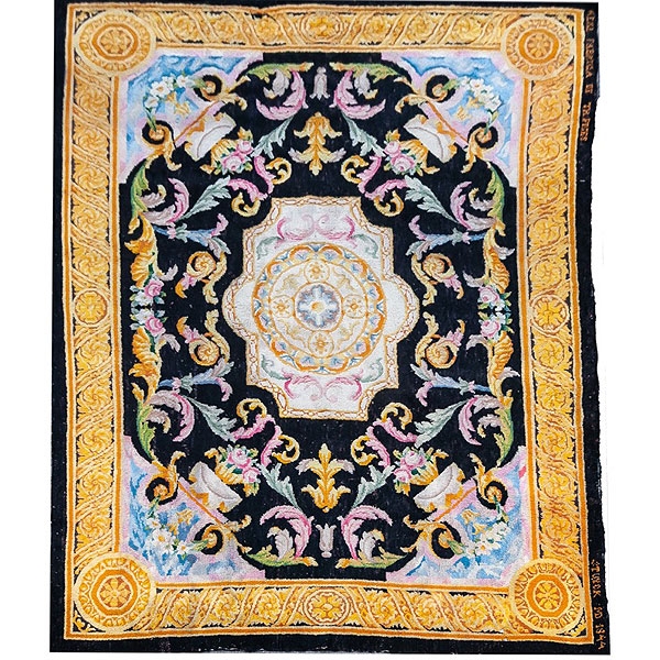 Alfombra de nudo turco de la Real Fábrica de Tapices de fondo color negro con roleos, firmada "Real Fabrica de Tapices, Stuyck Madrid 1844". Faltas