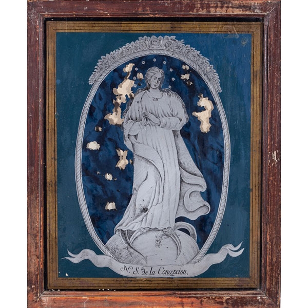 Espejo pintado por el reverso "Nuestra señora de la concepción" trabajo europeo ffs.SXVIII. Faltas