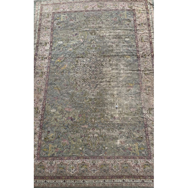 Alfombra persa de campo color verde jade y motivos animales y vegetales estilizados. Areas de fuerte desgaste y roturas. Precisa restauración