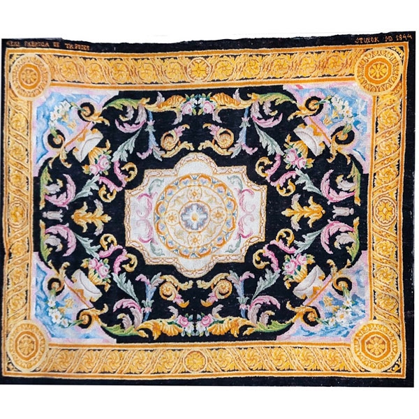 Alfombra de nudo turco de la Real Fábrica de Tapices de fondo color negro con roleos, firmada "Real Fabrica de Tapices, Stuyck Madrid 1844". Faltas