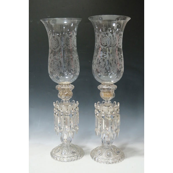 Pareja de candeleros franceses de cristal moldado con pantallas de cristal grabado al ácido