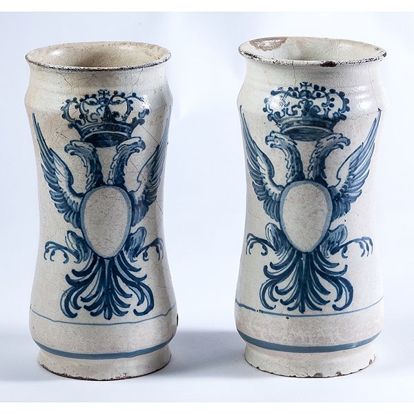 Pareja de albarelos de cerámica con ágila bicéfala, Talavera S.XVIII