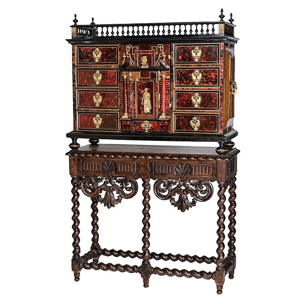 Bargueño sobre mesa de carey y molduras ebonizadas con aplicaciones de bronce, época Carlos II, S.XVII. Mesa tallada de época posterior. Faltas, precisa restauración
