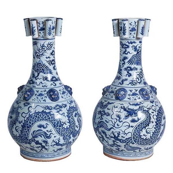Pareja de grandes jarrones chinos de porcelana azul y blanca con decoración de dragones