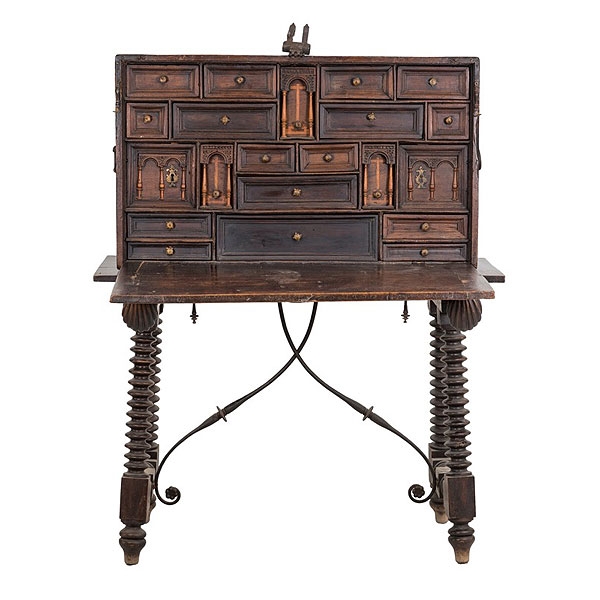 Bargueño de muestra cubierta de nogal con decoración moldurada y arquitectónica con embutidos de boj, Toledo S.XVII. Sobre bufete de patas torneadas "de lenteja" y fiadores de hierro.