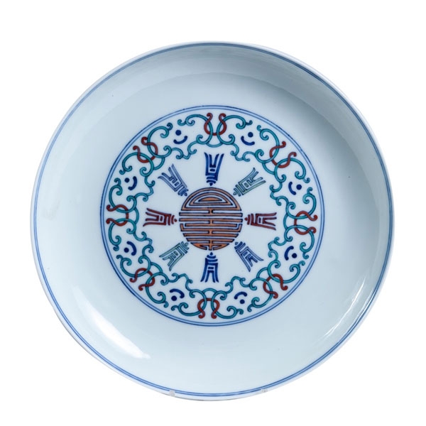 Plato de porcelana china con decoración en azul, verde y rojo S.XX