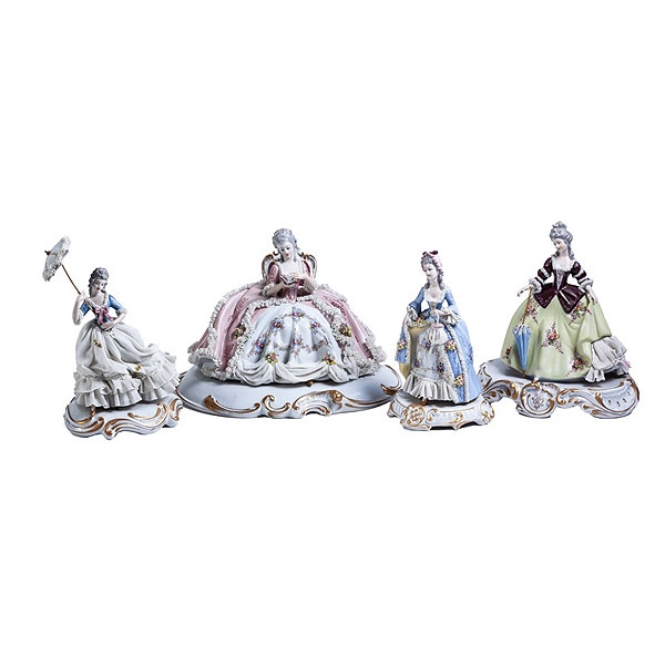 Conjunto de cuatro figuras de porcelana de Nápoles representando a damas a la manera del siglo XVIII.
