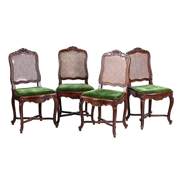 Sillería francesa compuesta por seis sillas y dos butacas, estilo Luis XV. Faltas en algunas rejillas 93 x 85 x 43 cm las butacas 99 x 50 x 52 cm las sillas