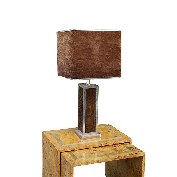 Lámpara de sobremesa de acero cromado y terciopelo marrón en diseño de Willy Rizzo, años 70