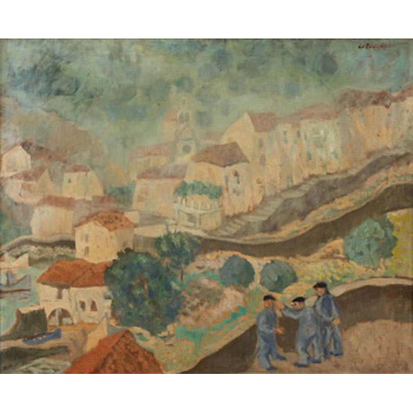 (Bilbao 1938) "Puerto vasco con arrantzales " Firmado: Luzuriaga Óleo / Lienzo