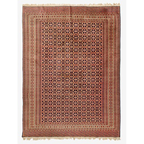 Alfombra de lana con decoración geométrica, vegetal y greca alrededor en tonos granates, camel y azules.