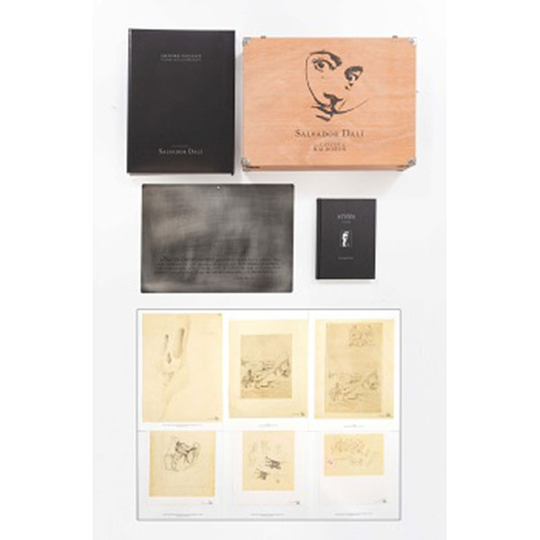 Carpeta compuesta por 6 volúmenes con cada uno de los cantos. carpeta de dibujos con 16 reproducciones facsímiles (dibujos y pruebas de estado); Libro de Estudio. Certificado Notarial, Ejemplar 2.592/2998. Cataluña, 2011.Maletin original en madera.