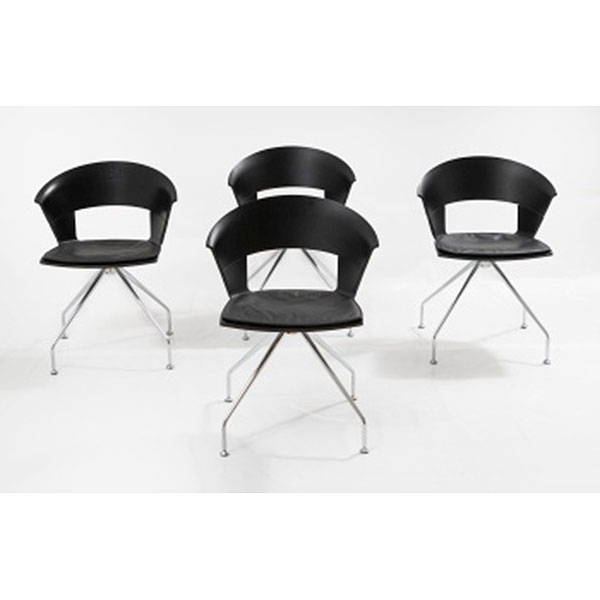 Conjunto de 4 sillas giratorias, modelo "Basilissa", en madera lacada en negro y patas en acero cromado. Cojín de cuero. Guialmi.