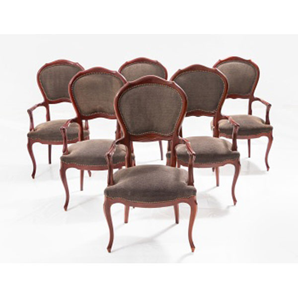 Conjunto de 6 butacas de comedor en madera de caoba, con asiento y respaldo tapizado en pana tono marrón rematando en tachuelas. Estilo Luis XV. S. XX