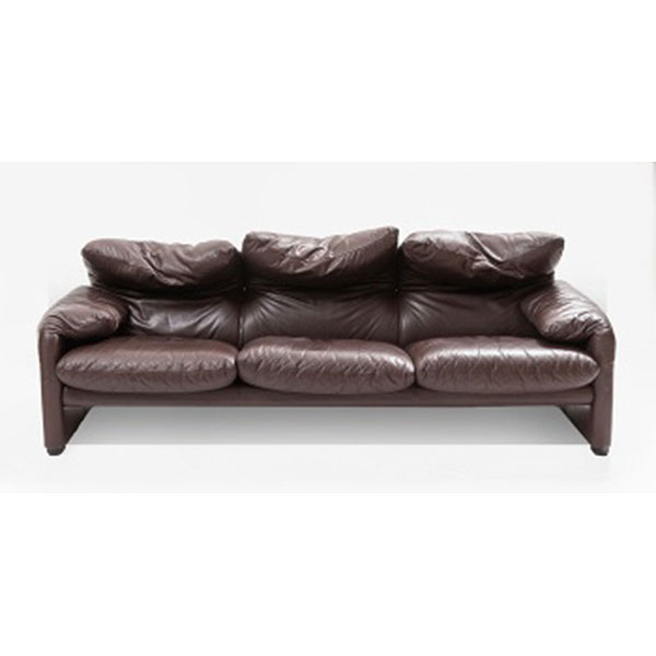 Sofá de 3 plazas en piel color marrón, espuma de poliuretano inyectada, relleno Dacron y almohadones Fiberfill. Mobilplast. Diseño: V. Magistretti. Colección: Cassina. S. XX