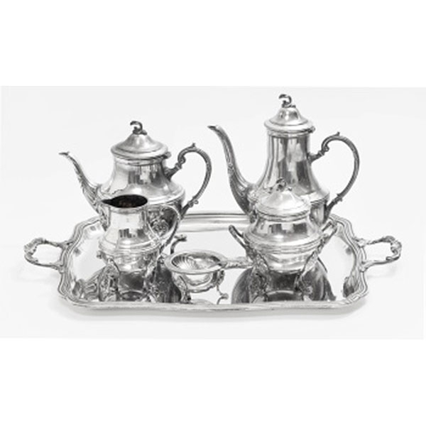 Juego de café y bandeja en plata con decoración vegetal, flores y rocallas, compuesto por: cafetera, tetera, lechera, colador y cucharilla de azúcar. Marcas del platero Cruz de Malta. S. XX
