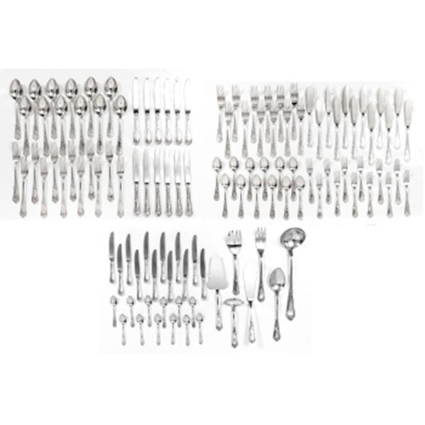 Compuesta por 115 piezas: 12 cucharas de mesa,12 tenedores de mesa, 12 cuchillos de mesa, 12 tenedores de pescado, 12 palas de pescado, 12 cucharillas de postre, 12 tenedores de postre, 12 cuchillos de postre, 12 cucharillas de café y 7 piezas de servir: cazo, cucharón, cazo de salsa, pala y tenedor de trinchar, tenedor de servir y pala de tarta.