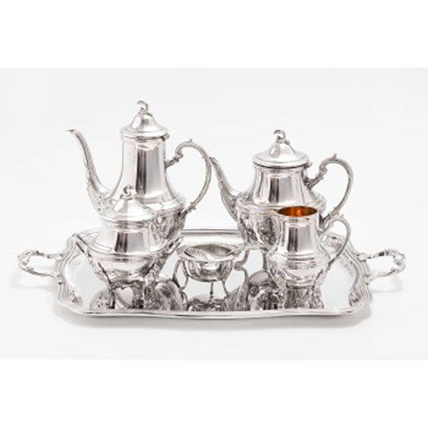Juego de café y bandeja en plata con decoración vegetal, flores y rocallas, compuesto por: cafetera, tetera, lechera, azucarero, colador y cucharilla de azúcar. Estilo Luis XVI. Marcas del platero Cruz de Malta. S. XX