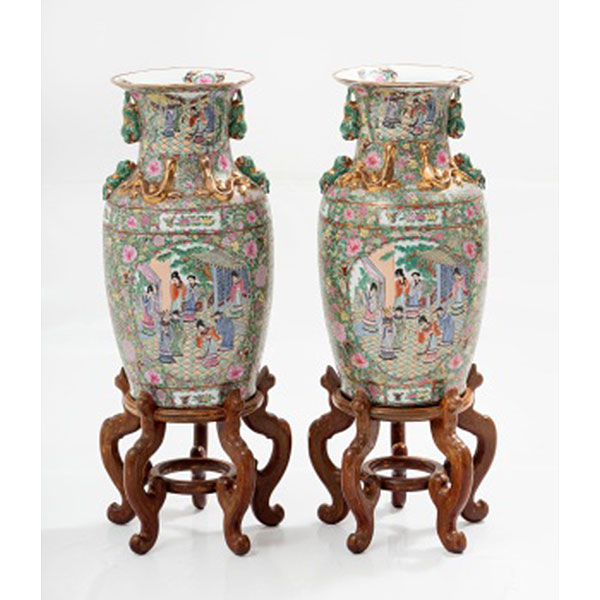 Pareja de jarrones orientales en porcelana dorada y pintada en relieve con medallones centrales representando escenas palaciegas, flores, mariposas y hojas alrededor.