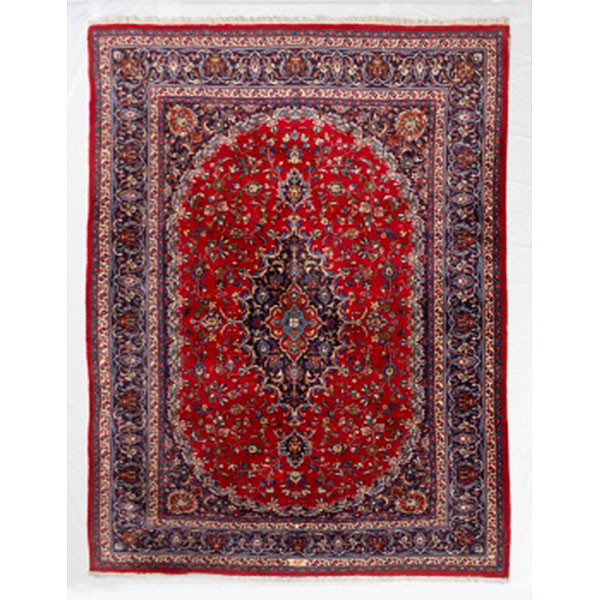 Alfombra de lana con decoración de 2 medallones centrales con decoración vegetal, flores y rocallas rematando con greca alrededor en tonos granates, beige, azul, verdes, etc.