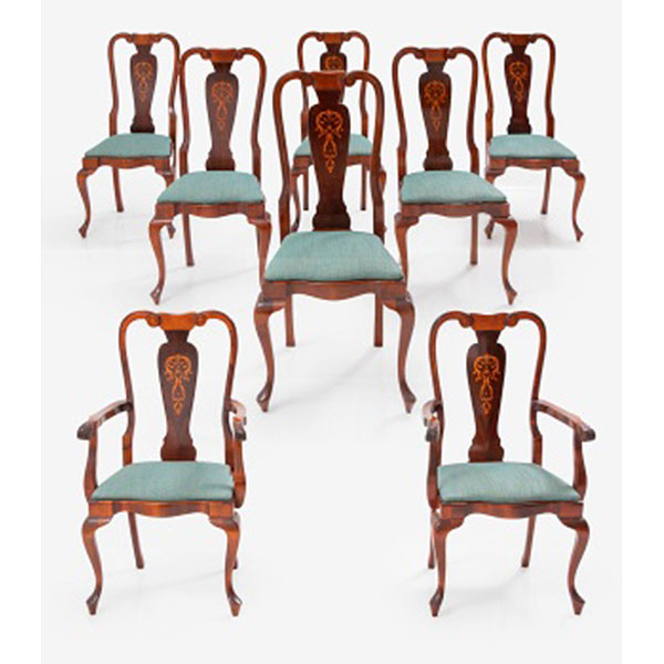 Sillería de comedor compuesta por 6 sillas y 2 butacas en madera de caoba y marquetería Estilo Luis XV. Época: S. XX