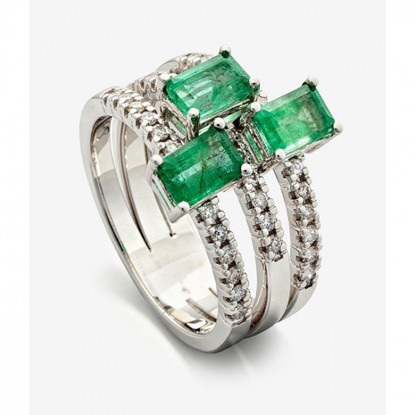 Sortija en oro blanco formada por 3 aros con esmeraldas centrales y diamantes talla brillante a los lados en cada uno, con un peso total de 0,60 cts. aprox.