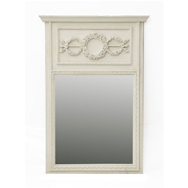 Espejo trumeau en madera tallada y pintada en blanco con decoración de guirnaldas de flores y hojas. Estilo Luis XVI.