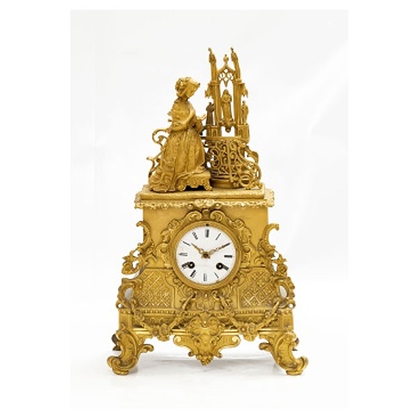 Reloj de sobremesa en bronce dorado con oro fino al mercurio con figura central representando dama de corte leyendo, al fondo retablo de Virgen con niño y Santos. Base con decoración vegetal, guirnaldas y rocallas. Esfera blanca esmaltada con números romanos, sonería de horas y medias. Época Napoleón III. Francia