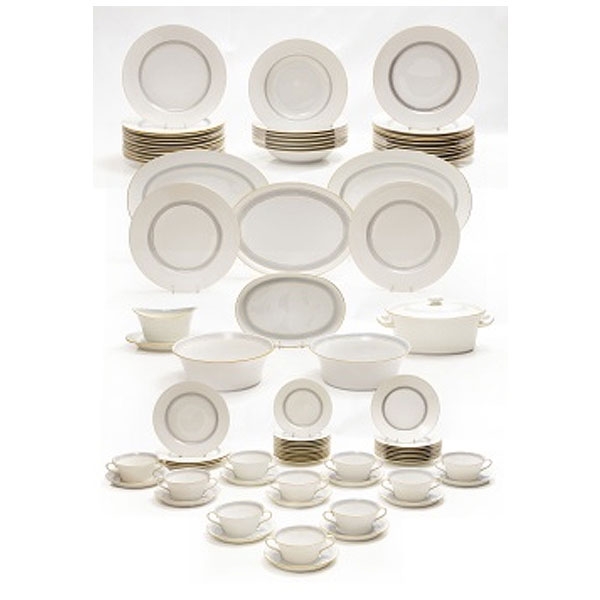 Vajilla en porcelana policromada blanca, gris y dorada compuesta por 72 piezas: 7 platos hondos, 21 platos llanos, 4 platos de postre, 8 platos de merienda, 11 platos de pan, 11 tazas y platos de consomé, 2 fuentes ovales, 2 platos de entremeses, bandeja de legumbres, 2 ensaladeras, sopera, salsera, bandeja oval pequeña. Adams Graff Bon Wersin. Marcas en la base Nymphenburg.