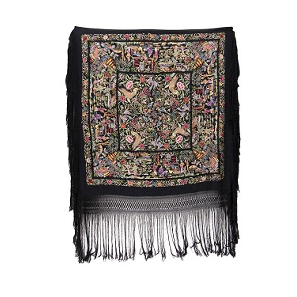 Mantón negro bordado con decoración oriental representando personajes, pagodas, flores, aves, etc.