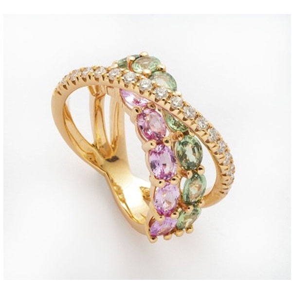 Sortija triple en oro rosa con 7 zafiros rosas, 7 zafiros verdes y fila de diamantes talla brillante con un peso total de 0,70 cts. aprox.
