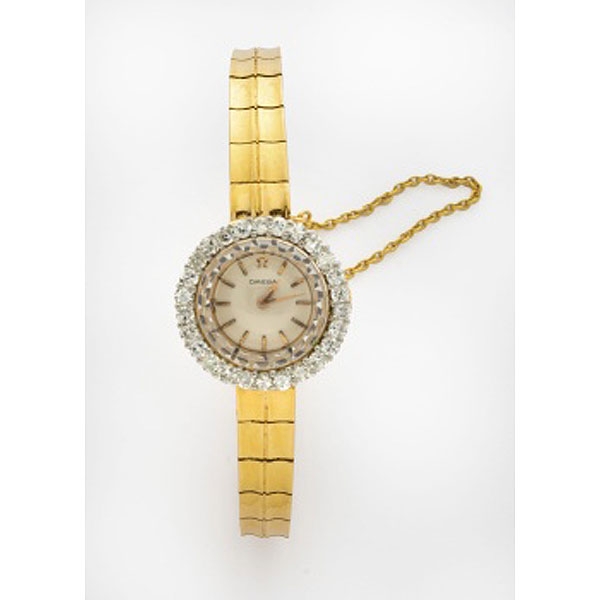 Reloj de señora marca Omega con caja y pulsera en oro amarillo y orla de diamantes talla brillante con un peso total de 0,90 cts. aprox.