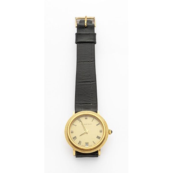 Reloj de caballero marca Tiffany con caja dorada, esfera con números romanos