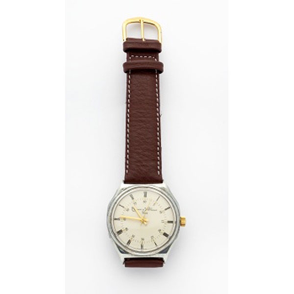 Reloj de caballero marca Cuervo y Sobrino con caja en acero, esfera blanca, números romanos y correa en piel marrón.
