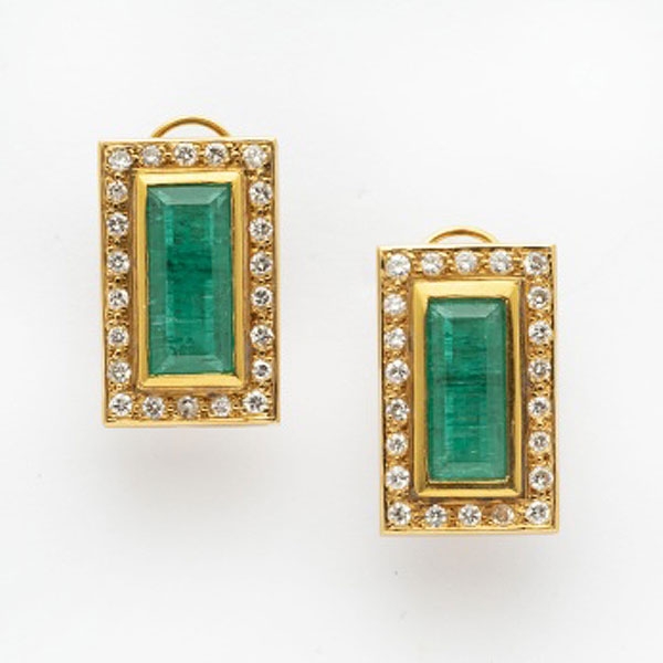 Pendientes en oro amarillo con 2 esmeraldas centrales de un peso total de 6 cts. aprox. y orla de diamantes talla brillante con un peso total de 0,50 cts.aprox.