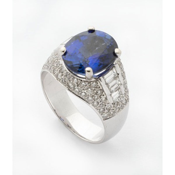 Sortija en oro blanco con zafiro azul central, 6 diamantes talla baguette y cuajado de diamantes talla brillante con un peso total de 1,30 cts. aprox.