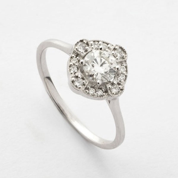 Sortija en oro blanco con diamante talla brillante central de 0,50 cts. aprox y orla de diamantes talla brillante con un peso total de 0,10 cts..