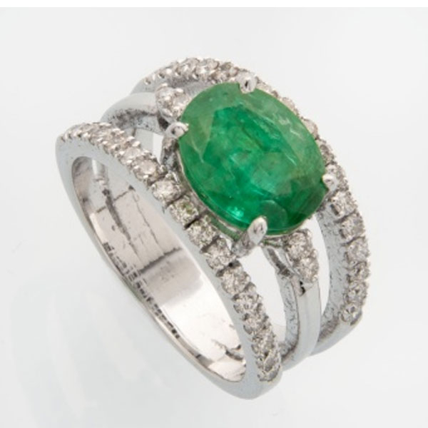Sortija en oro blanco con esmeralda central de un peso 2,25 cts. aprox. y 2 filas de diamantes talla brillante con un peso total de 0,60 cts. aprox.