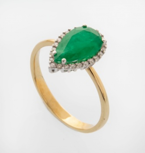 Sortija en oro amarillo con esmeralda central en forma de lágrima de un peso de 1,55 cts. aprox, y orla de diamantes talla brillante con un peso total de 0,15 cts. aprox.