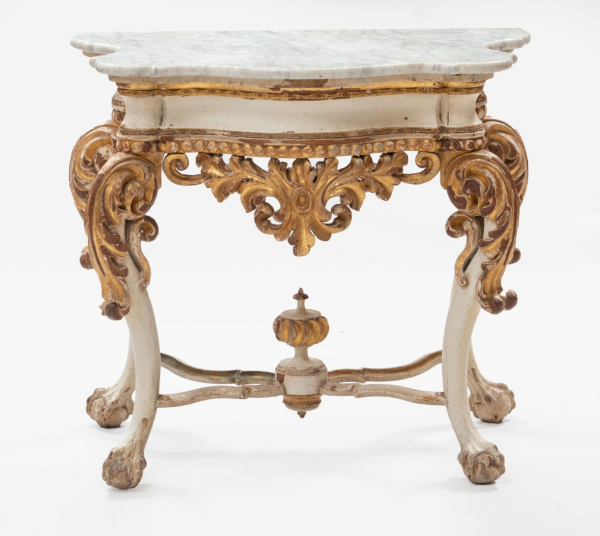 Consola en madera tallada, policromada y dorada con decoración vegetal, rocalla y copa central. Remates en pata de garra. Encimera de mármol blanco. Época Carlos IV